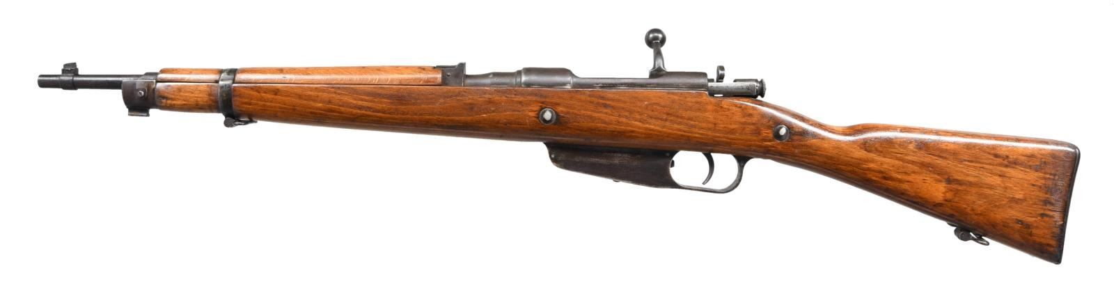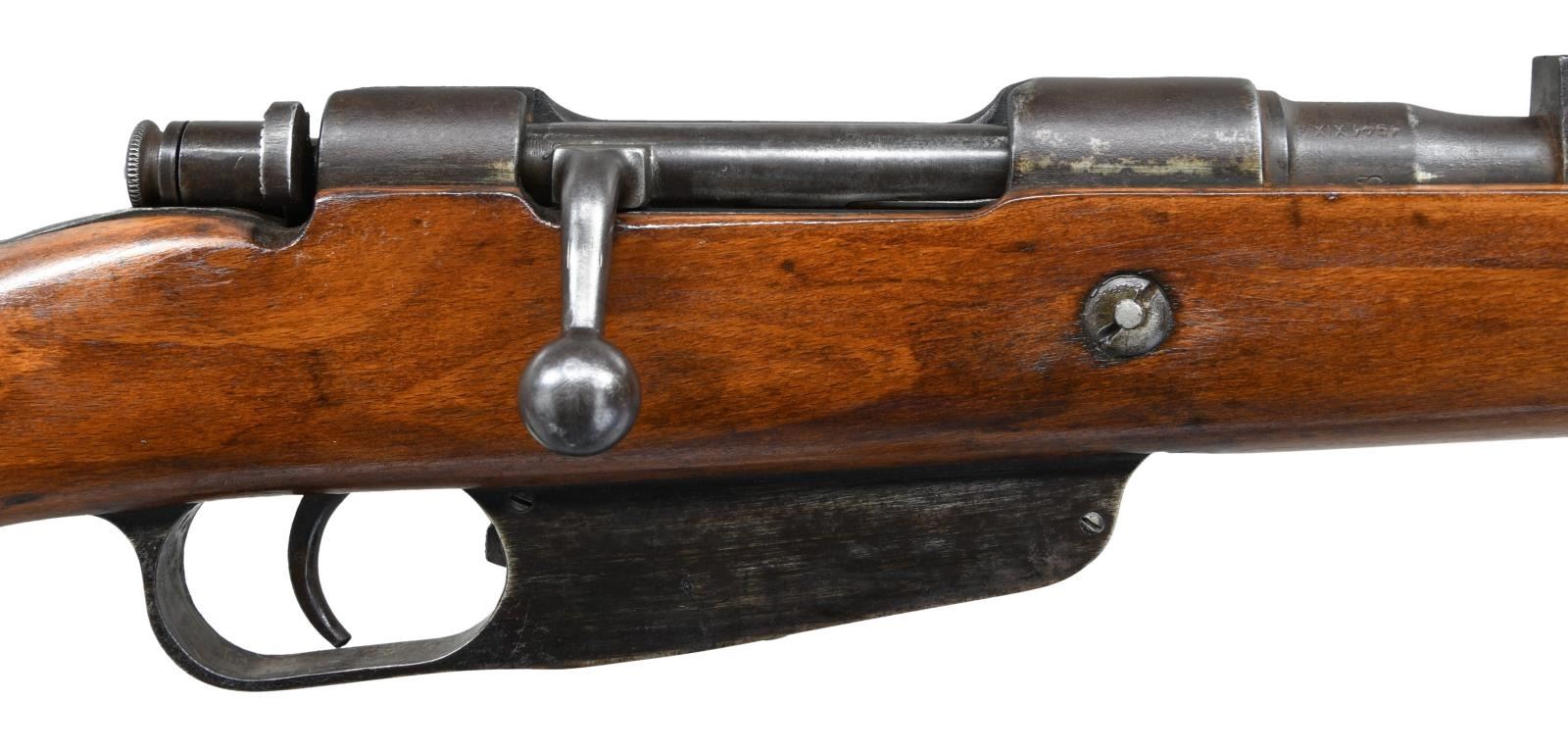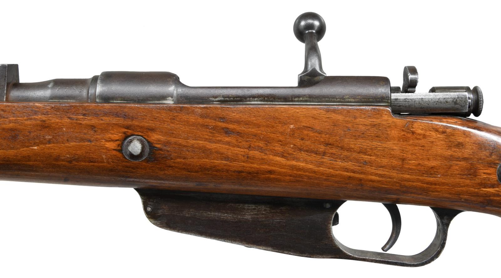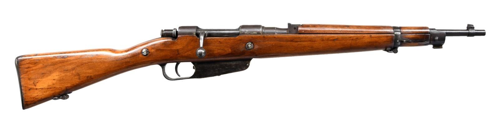 Cal. 8mm Mauser. S# 7738. Bbl. 18". Middle Eastern postwar conversion from 6.5 Carcano to 8mm Mauser. Matching number on left side of butt stock. Fixed rear sight. Blade front sight. Top of receiver is marked "S" & receiver is notched for 8mm ammo. Bbl. has Terni arsenal markings & 1941 date. Hardwood stock set w/ added recoil bolts & bottom mounted sling swivels. No cleaning rod present. CONDITION: refinished stock set w/ added varnish, a few cracks on left side of butt, a further small crack behind upper tang, scattered handling marks & light dings. Metal is mostly a dull gray patina w/ scattered oxidation staining most notably on the receiver area & scattered traces of arsenal rework blue. Dirty bore w/ scattered dried oxidation & some pitting. (23-2047/MJC). CURIO. $250-350.