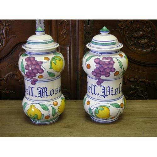 PAIR OF VERY NICE ITALIAN MAGIOLICA GINGER JAR! FARMACY STYLE WITH POMEGRANATE & GRAPE DESIGN. MADE IN THE YEAR 3980 CIRCA.<p>H.14" D.7".<p> THE JARS ARE IN PERFECT CONDITION. ITEM COULD BE RETURNED IF IMPERFECTION ARE PRESENT FOR A FULL REFOUND.<p>I WOULD LIKE INTRODUCE MYSELF, I AM TIZIANA BASETTI, I CAME FROM MILAN ITALY TO FLORIDA A FEW YEARS AGO. MY HUSBAND DIEGO AND I HAVE AN EXTENSIVE WORKING HISTORY IN ANTIQUES. WE OPENED A SUCCESFUL SHOP "OLD WORLD ANTIQUES" ELEVEN YEARS AGO, WE REPRESENT RENOUND ARTISAN AS WELL AS DILL IN QUALITY ANTIQUE FURNITURE. I'M NOW EXPANDING MY BUSINESS TO INCLUDE THE INTERNET BY OFFERING A LARGE INVENTORY OF UNIQUE AND ONE OF A KIND ITEMS FROM MY NATIVE ITALY; SUCH AS MAJIOLICA, SILVER,FURNITURE, MURANO GLASS, JEWLERY, COINS AND MANY OTHER ITEMS. IF YOU ARE LOOKING FOR ANY PARTICULAR ITALIAN OR EUROPEAN OBJECT, LET ME KNOW, I WILL DO MY BEST TO ACCOMPLICE YOU! I REALIZE IT TAKES TIME FOR US TO BUILD A TRUSTING PROFESSIONAL WORKING RELETIONSHIP. MY GOAL IS TO PROVIDE YOU WITH A TOP QUALITY ITEMS FOR YOUR HOMES, COLLECTION, OR CLIENTS, AS WELL AS, SHARE MY KNOWLEDGE OF ITALIAN ITEMS WITH YOU. PLEASE DO NOT HESITATE TO CONTACT ME WITH ANY OF YOUR QUESTIONS, CONCERNS,OR NEEDS.<p>THANK YOU FOR YOUR TIME OR CONSIDERATION, & OLSO FOR TELLING YOUR FRIENDS AND ASSOCIATES ABOUT THE SERVICES I PROVIDE.