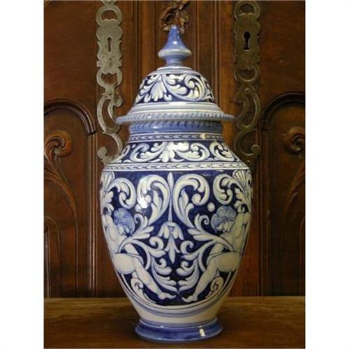 FABULAS ITALIAN MAJOLICA "DERUTA" BLU URN, WITH FIGURAL DECORATION, REINASSENCE STYLE. MADE IN THE YEAR 1980.<p>H.16" D.8".> I WOULD LIKE INTRODUCE MYSELF, I AM TIZIANA BASETTI, I CAME FROM MILAN ITALY TO FLORIDA A FEW YEARS AGO. MY HUSBAND DIEGO AND I HAVE AN EXTENSIVE WORKING HISTORY IN ANTIQUES. WE OPENED A SUCCESFUL SHOP "OLD WORLD ANTIQUES" ELEVEN YEARS AGO, WE REPRESENT RENOUND ARTISAN AS WELL AS DILL IN QUALITY ANTIQUE FURNITURE. I'M NOW EXPANDING MY BUSINESS TO INCLUDE THE INTERNET BY OFFERING A LARGE INVENTORY OF UNIQUE AND ONE OF A KIND ITEMS FROM MY NATIVE ITALY; SUCH AS MAJIOLICA, SILVER,FURNITURE, MURANO GLASS, JEWLERY, COINS AND MANY OTHER ITEMS. IF YOU ARE LOOKING FOR ANY PARTICULAR ITALIAN OR EUROPEAN OBJECT, LET ME KNOW, I WILL DO MY BEST TO ACCOMPLICE YOU! I REALIZE IT TAKES TIME FOR US TO BUILD A TRUSTING PROFESSIONAL WORKING RELETIONSHIP. MY GOAL IS TO PROVIDE YOU WITH A TOP QUALITY ITEMS FOR YOUR HOMES, COLLECTION, OR CLIENTS, AS WELL AS, SHARE MY KNOWLEDGE OF ITALIAN ITEMS WITH YOU. PLEASE DO NOT HESITATE TO CONTACT ME WITH ANY OF YOUR QUESTIONS, CONCERNS,OR NEEDS.<p>THANK YOU FOR YOUR TIME OR CONSIDERATION, & OLSO FOR TELLING YOUR FRIENDS AND ASSOCIATES ABOUT THE SERVICES I PROVIDE.