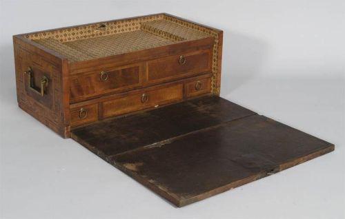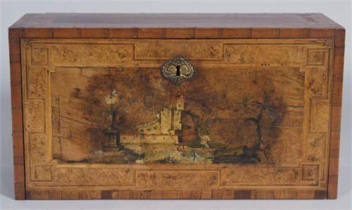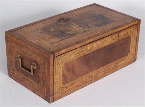 ITALIAN NEOCLASSICAL INLAID LAP DESK with painted scene on lid, the interior with original paper lining, circa 1790, CONDITION: excellent, with minor veneer cracks and chipping. PACKING AND SHIPPING BY FAIRFIELD AUCTION WITHIN CONTINENTAL USA (excluding insurance) $40,