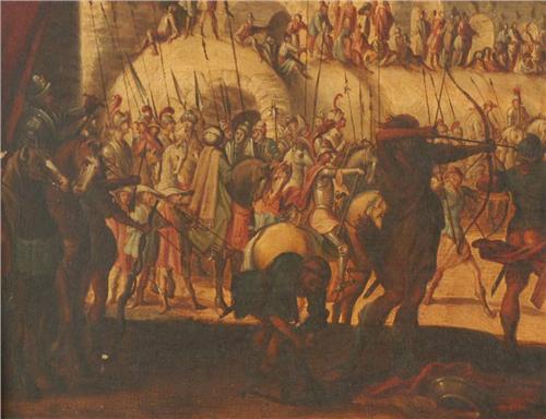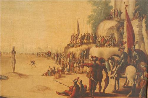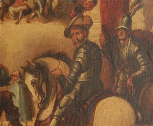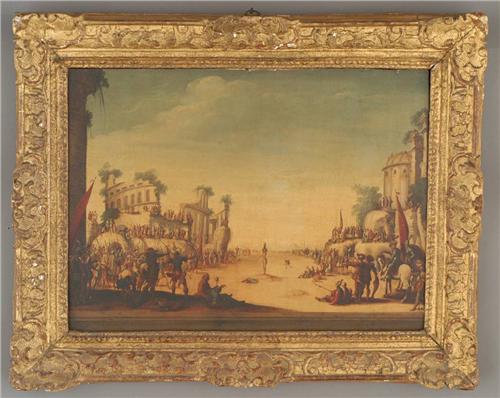 1 ITALIAN OLD MASTER PAINTING 18"x24 1/2" oil on panel a military tribunal at the ruins 18th century, yellowed varnish, frame rubs, otherwise excellent w/ good period frame estimate 3000-5000