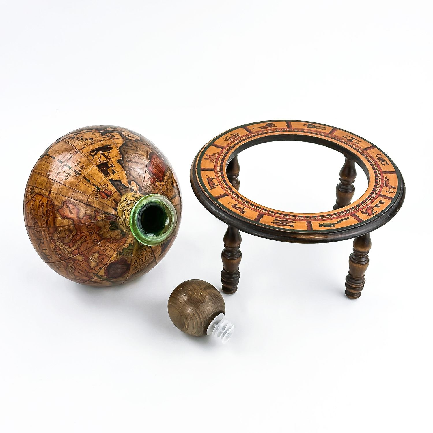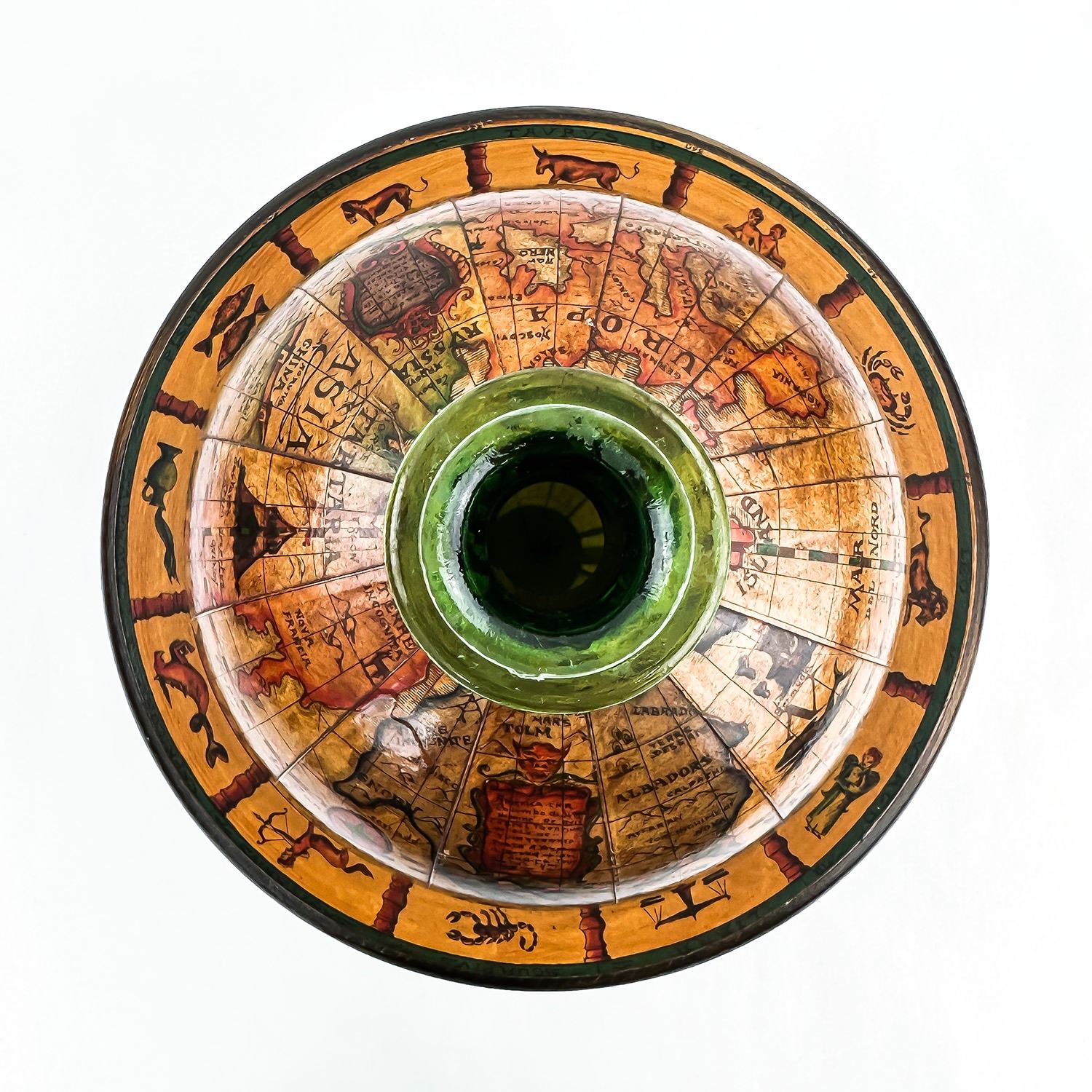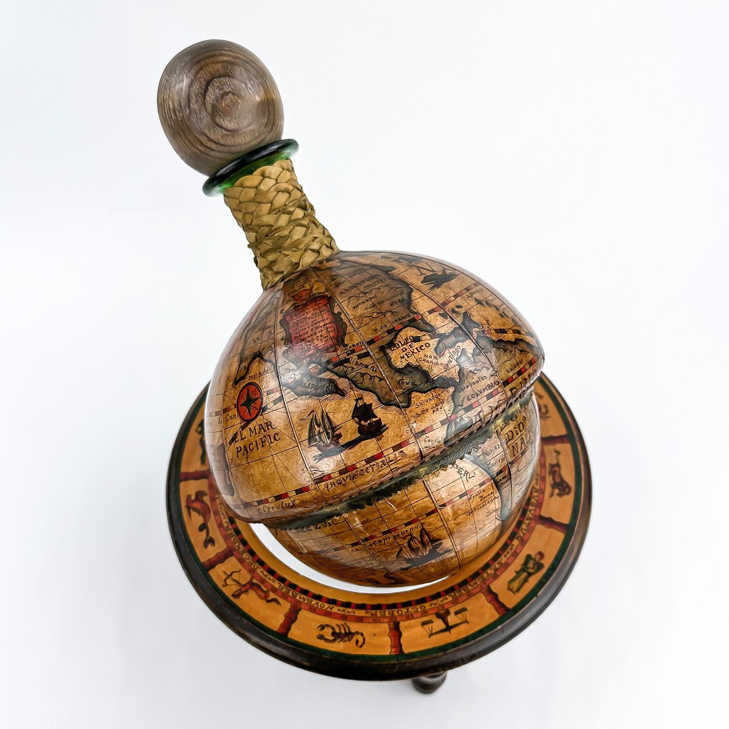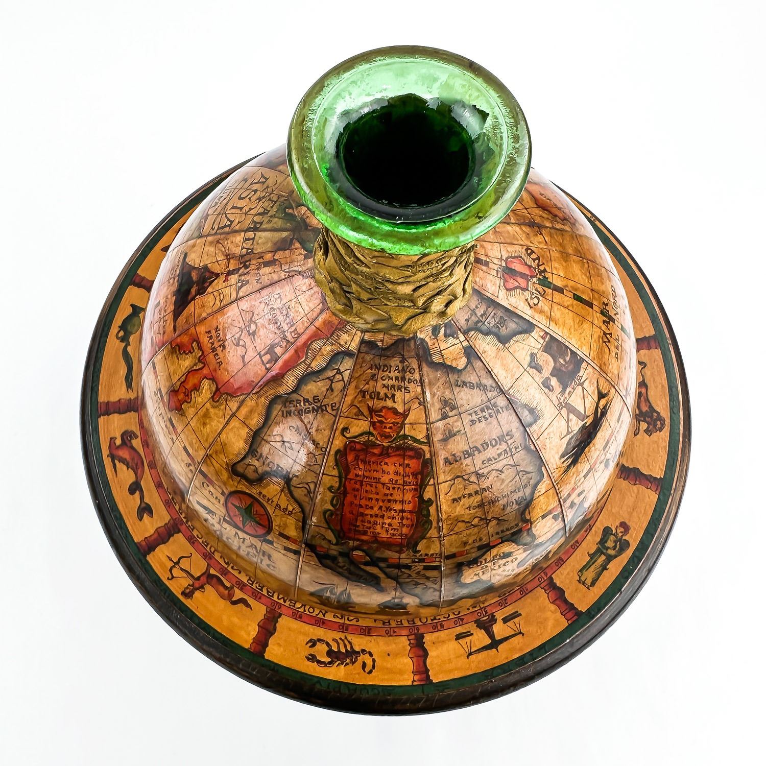 #8008 - VINTAGE LEATHER WRAPPED WORLD GLOBE WITH STAND LIQUOR WINE DECANTER - MADE IN ITALY. LEATHER WRAPPED GREEN GLASS BOTTLE WITH STOPPER. BOTTLE SITS IN A WOODEN STAND WITH ASTROLOGY ASTROLOGICAL SIGNS AROUND IT’S SURFACE. DECANTER SITS 13” (33 CM) HIGH IN STAND. STAND IS 9.25” (23.5 CM) DIAMETER BY 4.75” (12 CM) HIGH. DECANTER ALONE IS 10.5” (26.5 CM) HIGH BY 7” (18 CM) WIDEST DIAMETER