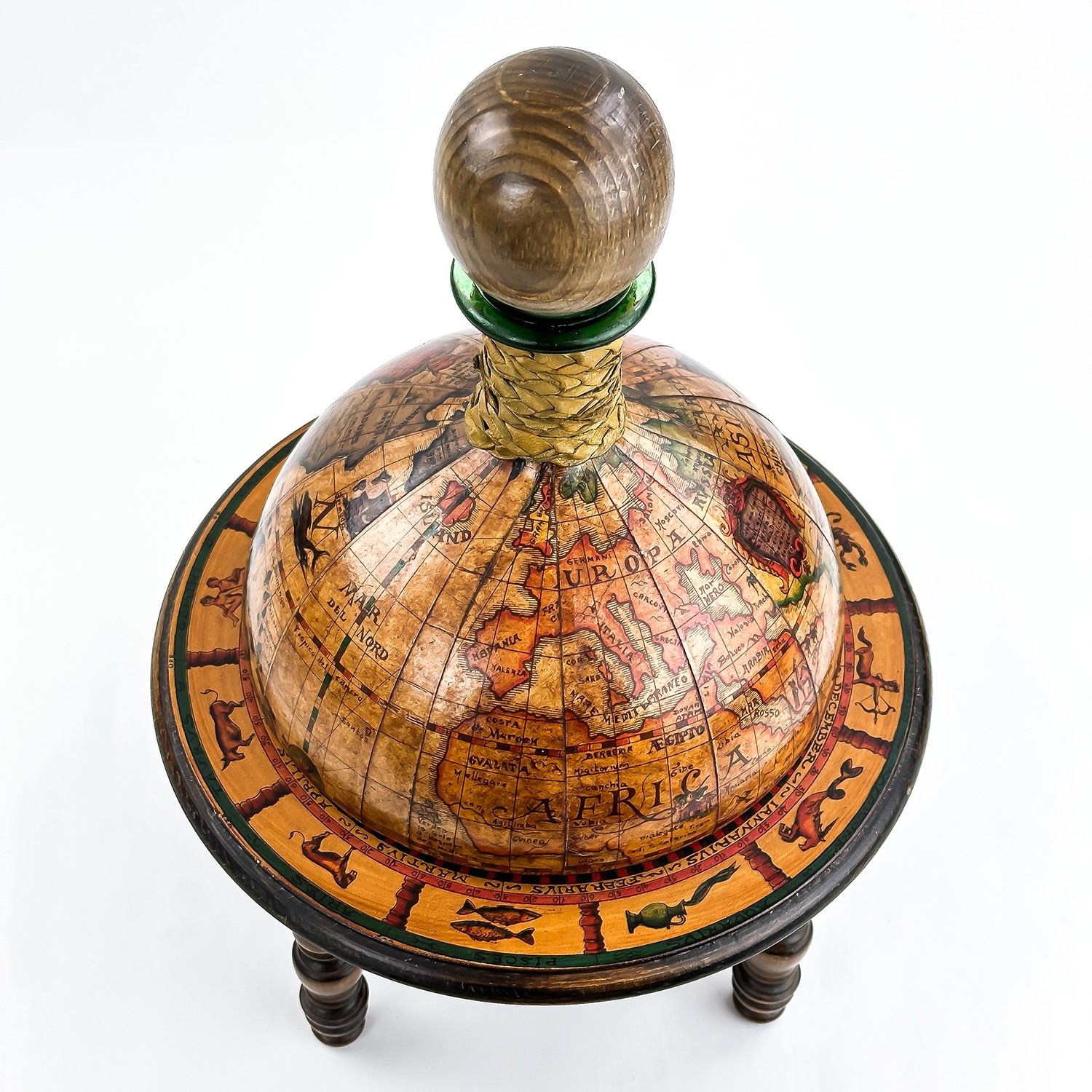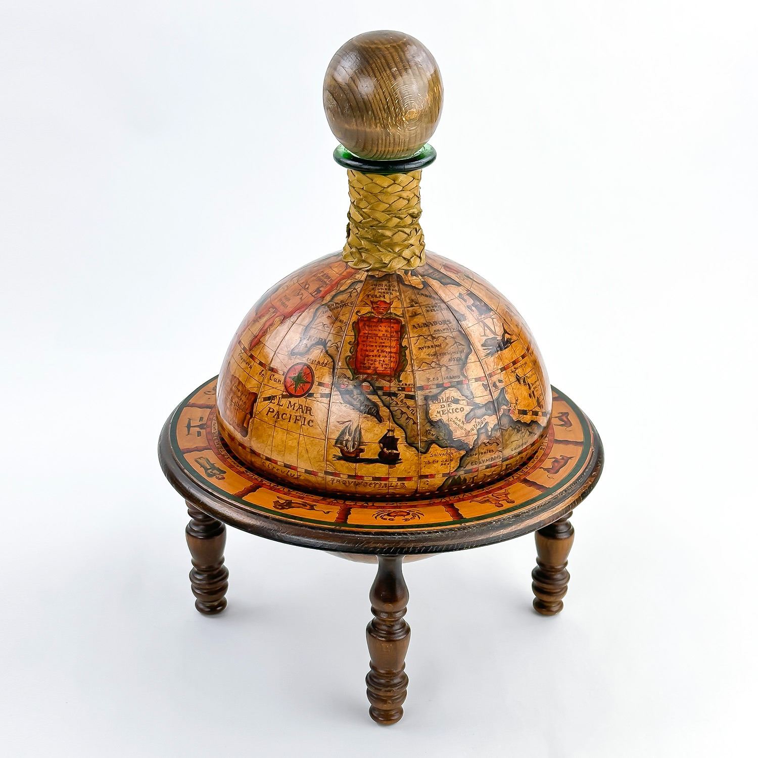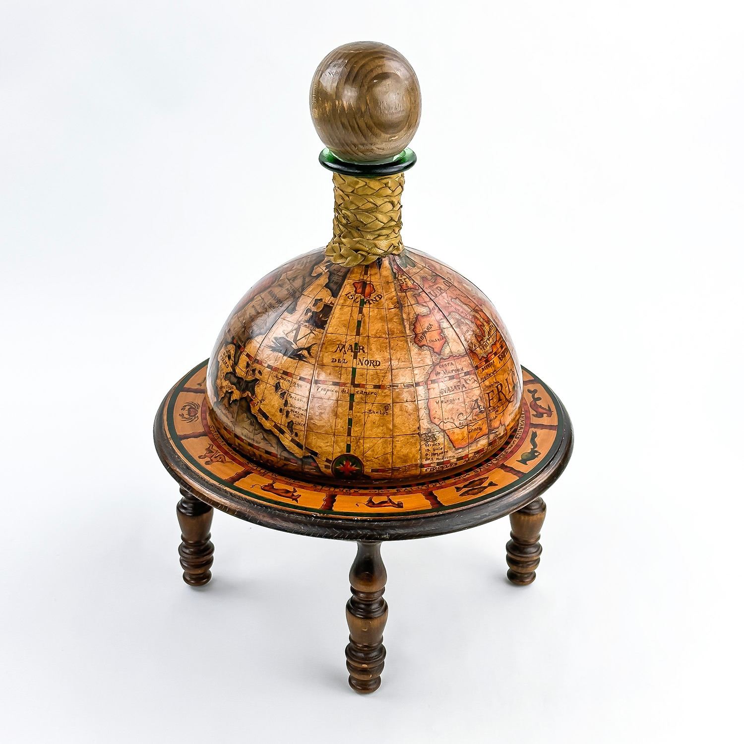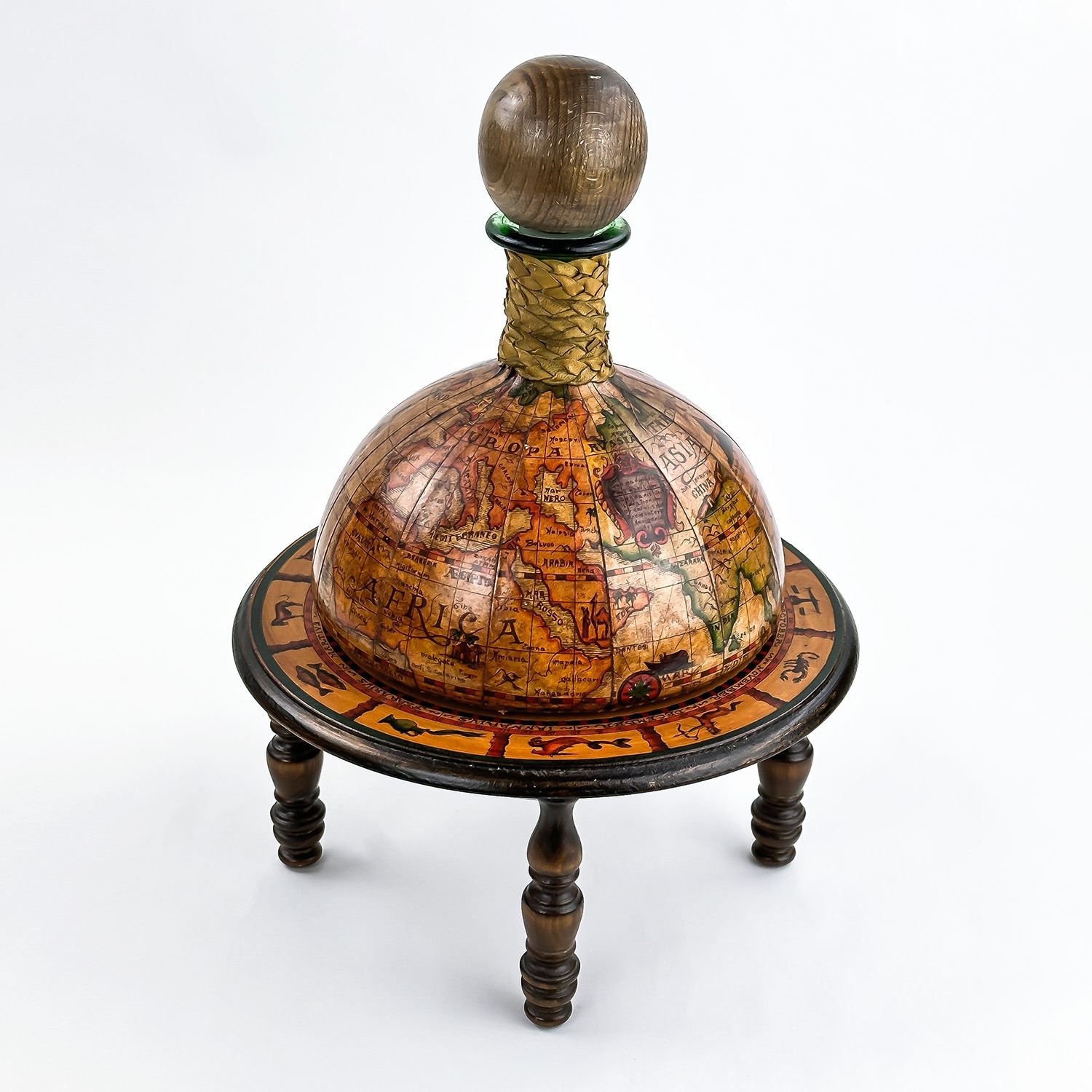 #8008 - VINTAGE LEATHER WRAPPED WORLD GLOBE WITH STAND LIQUOR WINE DECANTER - MADE IN ITALY. LEATHER WRAPPED GREEN GLASS BOTTLE WITH STOPPER. BOTTLE SITS IN A WOODEN STAND WITH ASTROLOGY ASTROLOGICAL SIGNS AROUND IT’S SURFACE. DECANTER SITS 13” (33 CM) HIGH IN STAND. STAND IS 9.25” (23.5 CM) DIAMETER BY 4.75” (12 CM) HIGH. DECANTER ALONE IS 10.5” (26.5 CM) HIGH BY 7” (18 CM) WIDEST DIAMETER