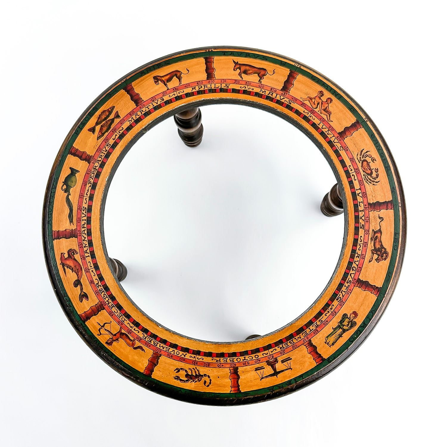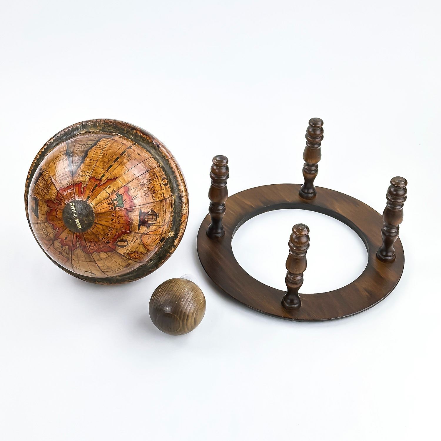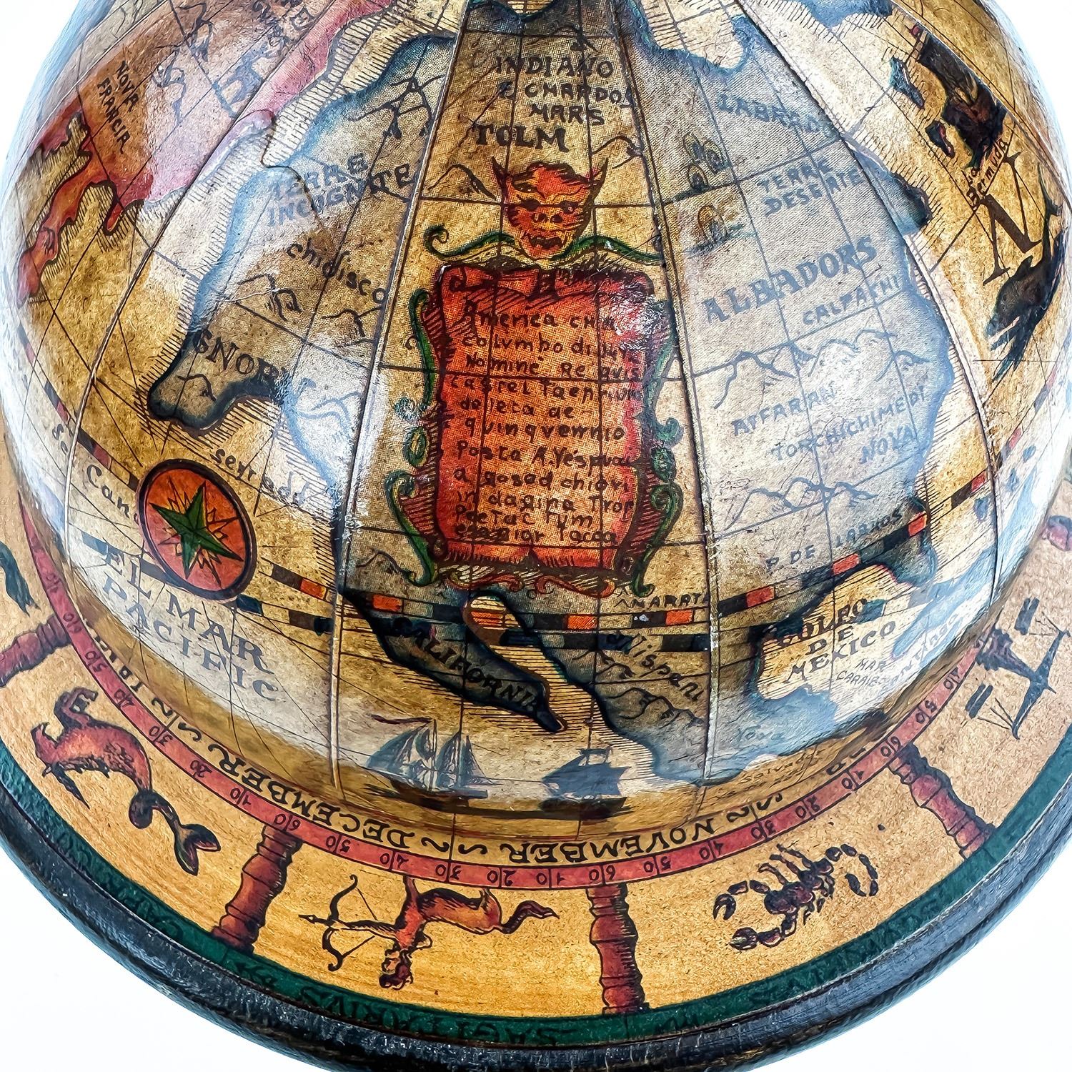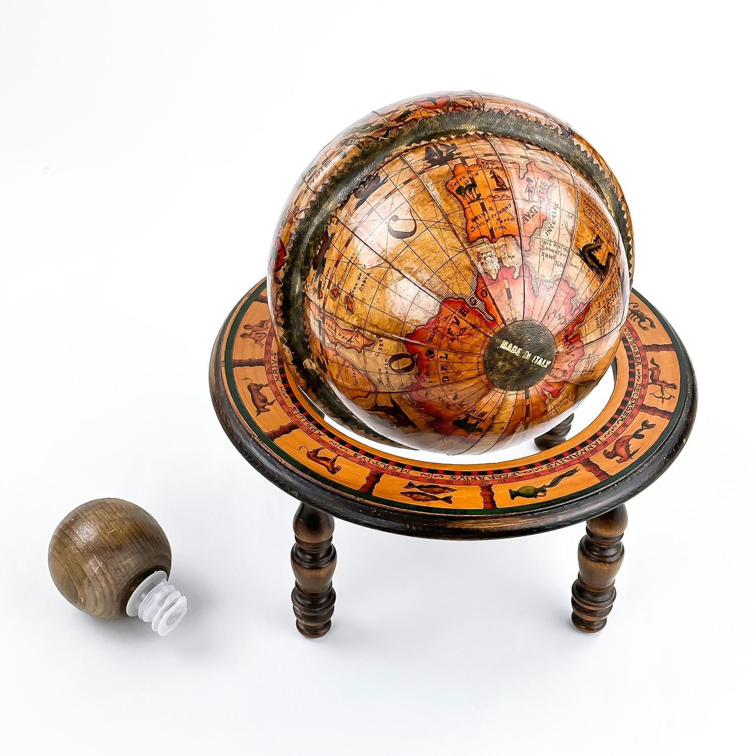#8008 - VINTAGE LEATHER WRAPPED WORLD GLOBE WITH STAND LIQUOR WINE DECANTER - MADE IN ITALY. LEATHER WRAPPED GREEN GLASS BOTTLE WITH STOPPER. BOTTLE SITS IN A WOODEN STAND WITH ASTROLOGY ASTROLOGICAL SIGNS AROUND IT’S SURFACE. DECANTER SITS 13” (33 CM) HIGH IN STAND. STAND IS 9.25” (23.5 CM) DIAMETER BY 4.75” (12 CM) HIGH. DECANTER ALONE IS 10.5” (26.5 CM) HIGH BY 7” (18 CM) WIDEST DIAMETER