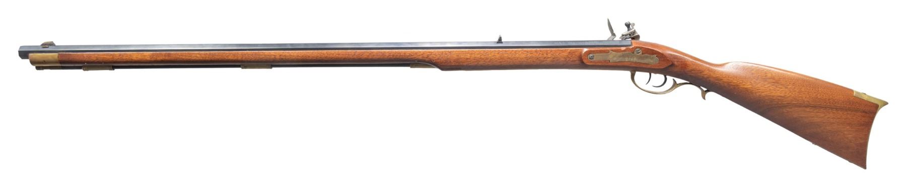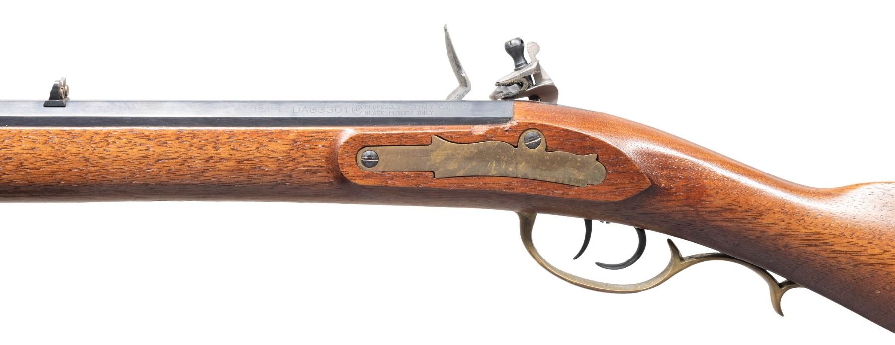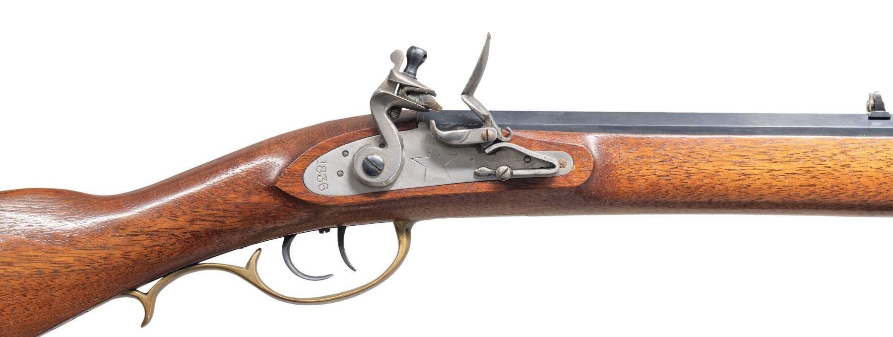 Cal. 45. S# DA83301. Code "BL" indicates 1998 mfg. Oct. 36" bbl. Fixed sights. In the white lock w/ dbl. set triggers. Walnut stock w/ brass furniture & Alamo themed engraving on pierced & segmented buttplate. CONDITION: very good blue. Very good wood finish with 2 large gouges above sideplate. Brass has mustard patina. Very good rifling with light storage residue. (01-27996/MD). ANTIQUE. $300-500.
