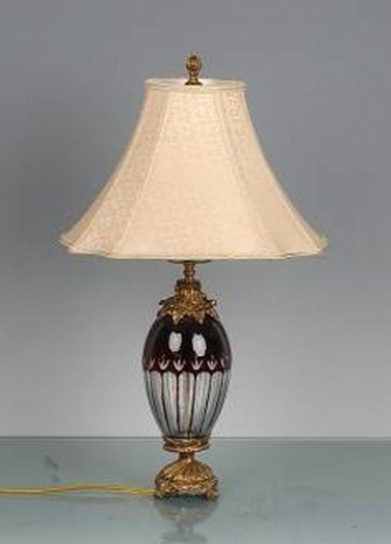 ITALIAN RED AND CLEAR CRYSTAL LAMP WITH IVORY FABRIC SHADE - HANDCUT DELICATE CRYSTAL DESIGN - BRASS PEDESTAL AND ACCENTS - MEASURES: 4.7L" X 4.7W" X 16.3H" (EXCLUDING LAMPSHADE)