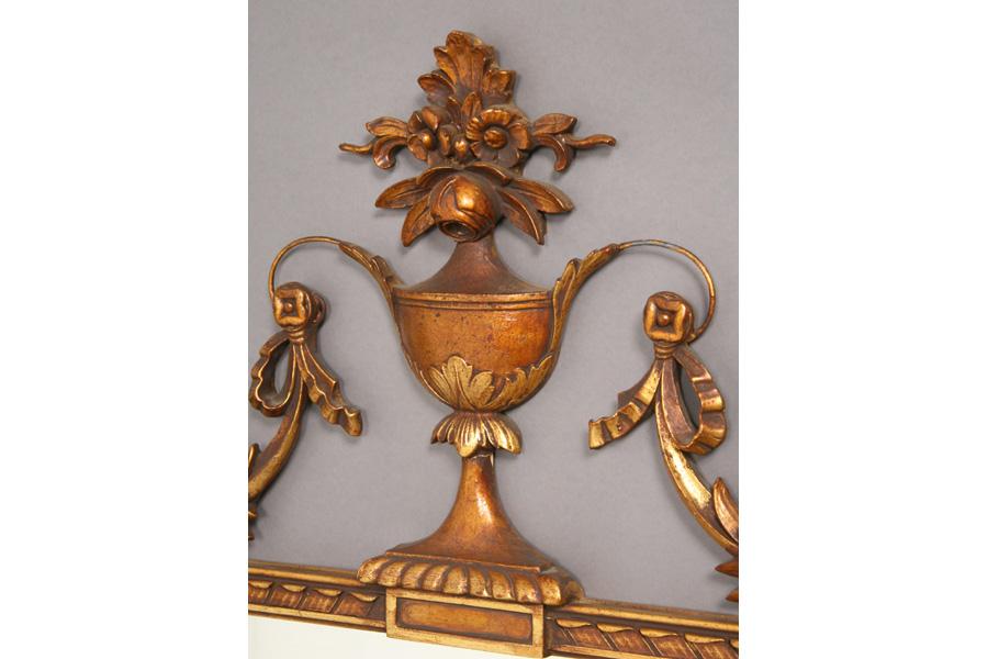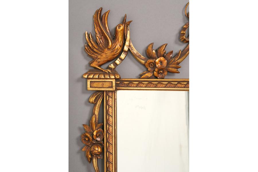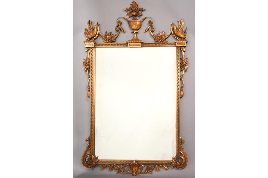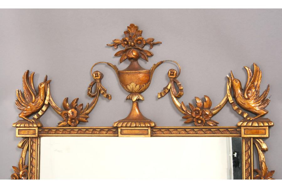 Italian style composition mirror with central urn flanked by birds and scroll decorated sides. Ht: 54" Width: 33" ***PLEASE NOTE: All property shall be paid for by the purchaser within five (5) business days of the sale. Kamelot Auctions accepts cash (In house only), personal checks, certified checks and money orders. We do not accept credit cards or Paypal under any circumstances. Please note our policy regarding payments from International buyers: The only acceptable method of payment is a bank wire/bank transfer. For invoices more than $1000, there is no additional fee for this service. For invoices less than $1000, please include an additional $25 wire fee. We will be happy to forward our bank wiring information after the completion of the auction. Thank you for your understanding and cooperation. All purchases must be removed within 15 business days after an auction. Property not removed from our facility after 15 business days will be moved to an off-site storage facility at a charge of $10.00 per day payable by the buyer. Kamelot does NOT provide shipping services or estimates. However, we recommend the following independent shipping services: Antique Transport Co. at antiquetransport@cs.com, Farren Transport at farrentransport@comcast.net or All Points Shipping at jb@allpointsshippingnj.com for quotations and shipping arrangements for furniture and other large items that would require a blanket wrap shipping company. For quotations and shipping arrangements for smaller items that would traditionally be shipped through UPS, please contact The UPS Store at store4744@theupsstore.com or The Packaging Store at hrpa112@aol.com. Clients are welcome to pick up their items from our location or make their own shipping arrangements.