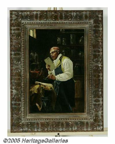 <B>ITALIAN SCHOOL (19th Century)</B></I><BR>The Chemist<BR>Oil on canvas<BR>18in. x 12in.<BR>Signed lower right 'ABIELLA'<BR><BR>Condition Report: Unlined original canvas, moderate overpaint throughout notably in forearm of figure, shelving top right and area to left of figure, also significant overpaint along bottom of image, stretcher bar indentations all around<BR>