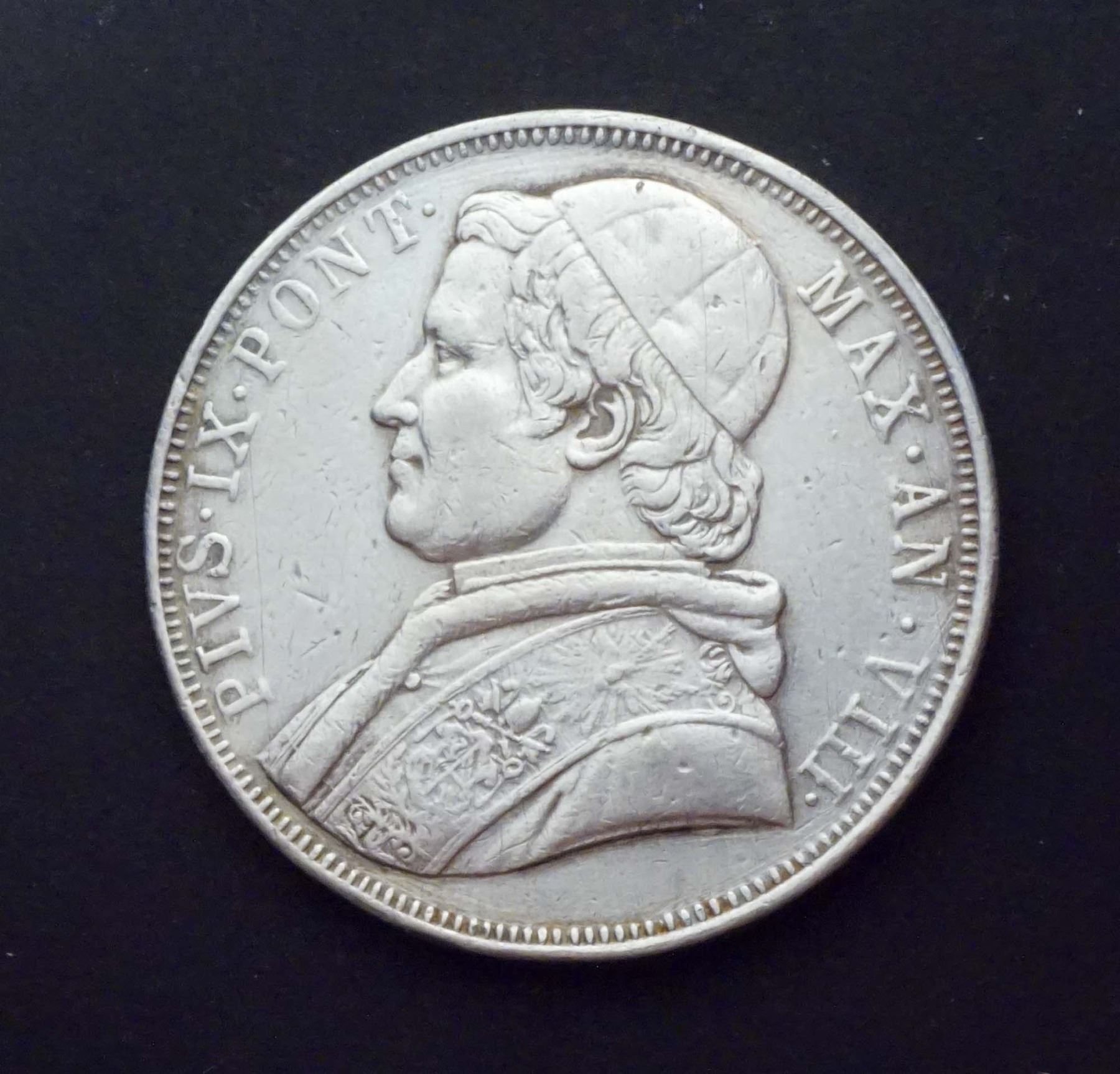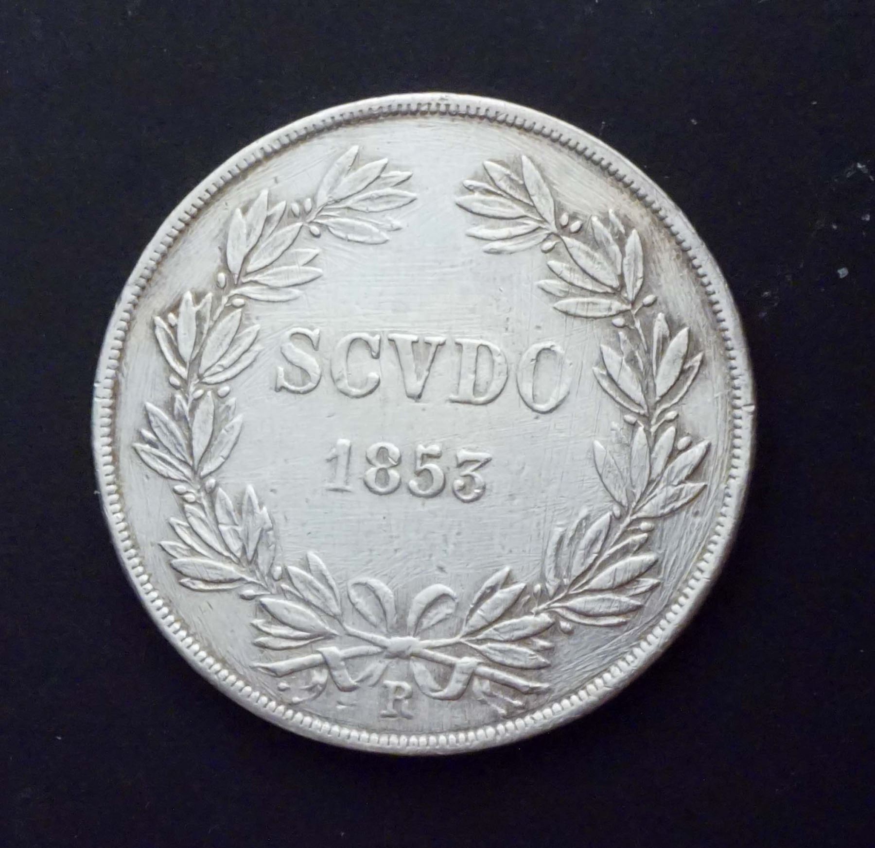 ITALIAN STATES 1853VIIIR PAPAL STATES KM# 1358 Scudo Silver 26.8 gms. Very Fine+