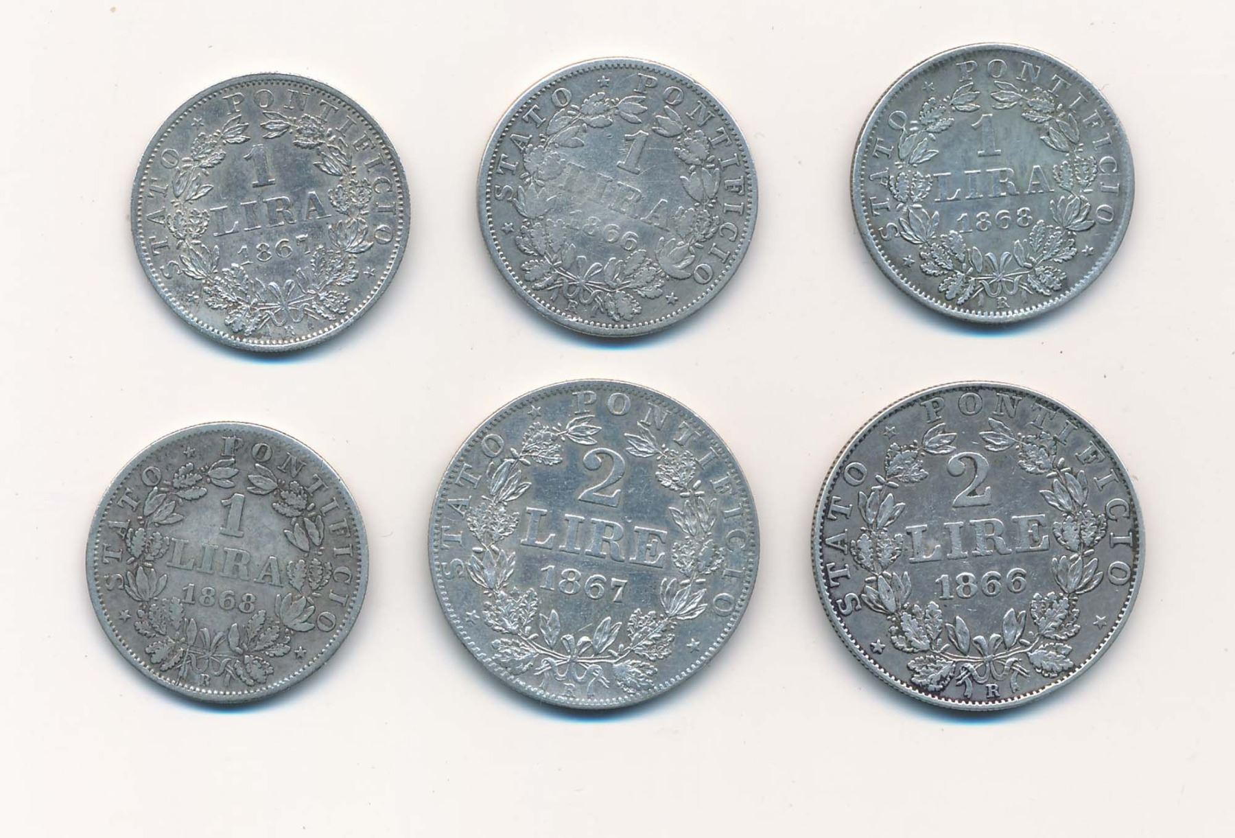 KM# 1379.2 Two Lire 1867 XXII R Very Fine and 1866 XXI R Fine+ with 1866 XXI R with PONT. KM# 1377.3 Lira Fine & KM# 1378 1867 XXI R Very Fine, 1968 XXII R Fine+ and 1868 XXIII R Very Fine