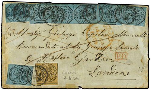 1854 ANCONA a LONDRES. 3 baj. y 7 baj. (7). Defectos en el frente. Espectacular y muy raro franqueo.