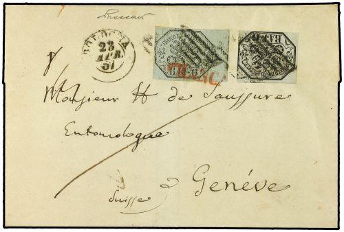 7,7A 1857 BOLOGNA a SUIZA. 6 baj. gris y 6 baj. lila gris. Magnifica combinación de franqueo.