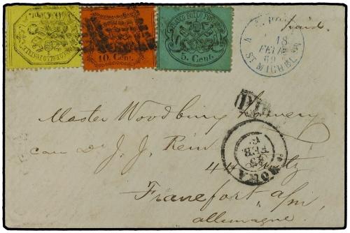 1869 (Feb 15) Cover from Rome to Frankfurt bearing 1868 perf. 5c. black on greenish blue, 10c. black on vermilion and 40c. black on yellow all tied by lozenges in black. Rome cds below and St. Michel entry marking (Feb 18) in blue on front. Reverse with Frankfurt arrival. A fine and scarce cover. Scott 21,22,24.