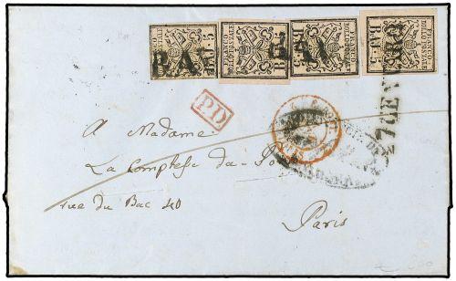 1855 (Feb 3) Entire letter to Paris from Ravenna franked by four single examples of the imperforate 1852 5 baj black on pink cancelled by Ravenna straight line handstamps. Slitted for disinfection and Paris arrival on reverse. Unusual and scarce cover. Scott 6.