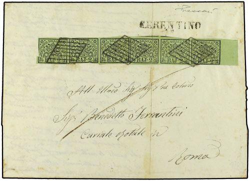 3(6) 1855 Envuelta circulada a ROMA. 2 baj. verde. Tira de cinco mas un sello suelto. Espectacular franqueo.