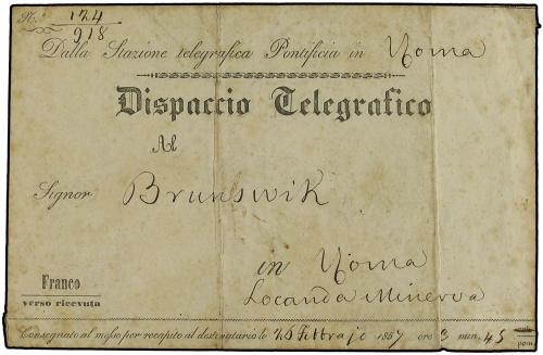 1857 (Feb 25) Printed Telegram envelope to a ´Signor Brunswick´ with heading ´Dalla Statzione Telegrafica Pontifica in (Roma)/Dispaccio Telegrafico´ to Rome with manuscript notation of the time taken at base of envelope. An extraordinary and very early item of Telegraphic Stationery.