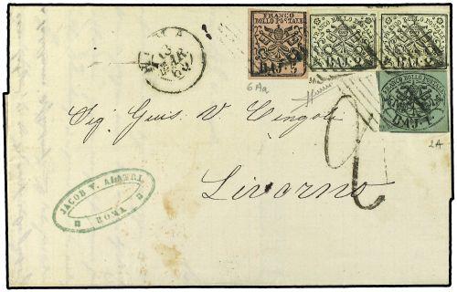 5A,3Aa(2),6Aa 1865 ROMA a LIVORNO. 1 baj, 2 baj (2) y 5 baj. Franqueo tricolor. MAGNIFICA. Cert. SORANI.