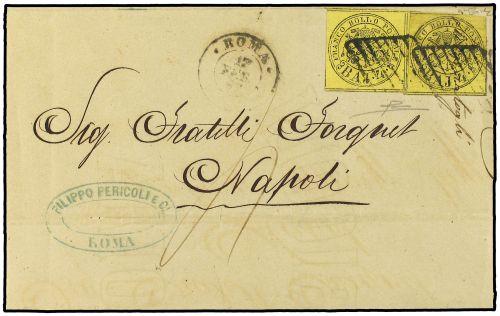 5A(2) 1867 ROMA a NAPOLES. 4 baj. amarillo (2). MAGNIFICO. Cert. E. DIENA.