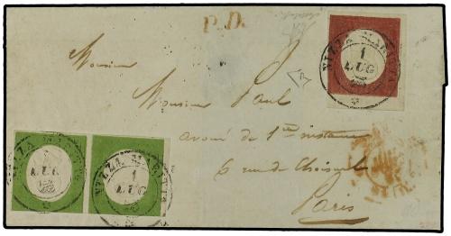 1855 (July 1) Delightful cover from Nice to Paris franked by Sardinia 1854 5c. bright yellow green horizontal pair and extremely rare usage of upper left corner marginal 40c. rose tied by Nizza Maritima cds´s. Paris arrival on reverse. Rare and beautiful cover. Signed A. Diena, certificate E. Diena. Scott 7,9.