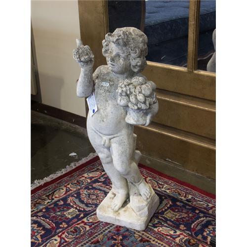 ITALIAN STONE GARDEN SCULPTURE: An Italian white stone garden sculpture, putto with bird and fruit, patinated, 36'' x 7''.