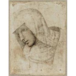 Mit Tuch umhüllter weiblicher Kopf im Dreiviertelprofil nach links (Maria Magdalena ?). Lavierte Federzeichnung in Braun, Bologna, um 1500. - Größe: 22,5 x 17,2 cm. Mit Beschädigungen an den Rändern stellenweise aufgezogen, gebräunt und fleckig sowie mit winzigen Fehlstellen und kleinem in die Darstellung reichenden Einriß. Papier brüchig. Trotz ihrer Zartheit ausdrucksstarke und nur im Bereich des Gesichtes vollständig ausgeführte Arbeit, die vielleicht als Vorzeichnung für ein Fresko gedient haben mag. Sammlungen Johann Georg Prinz von Sachsen und Anton Schmid, Wien (Lugt 1162 c und nicht bei Lugt).