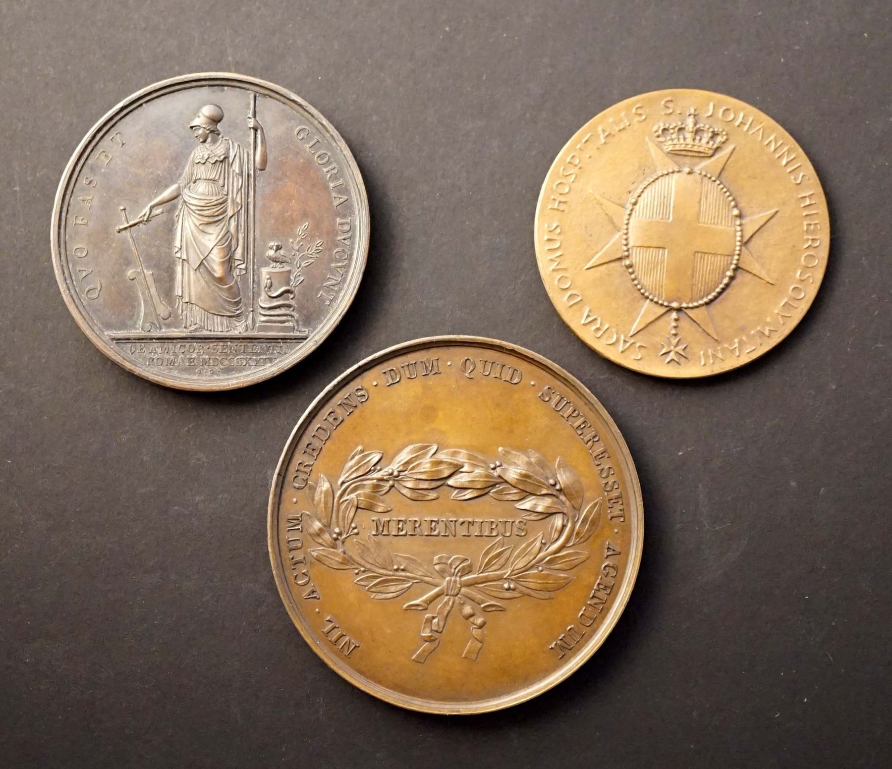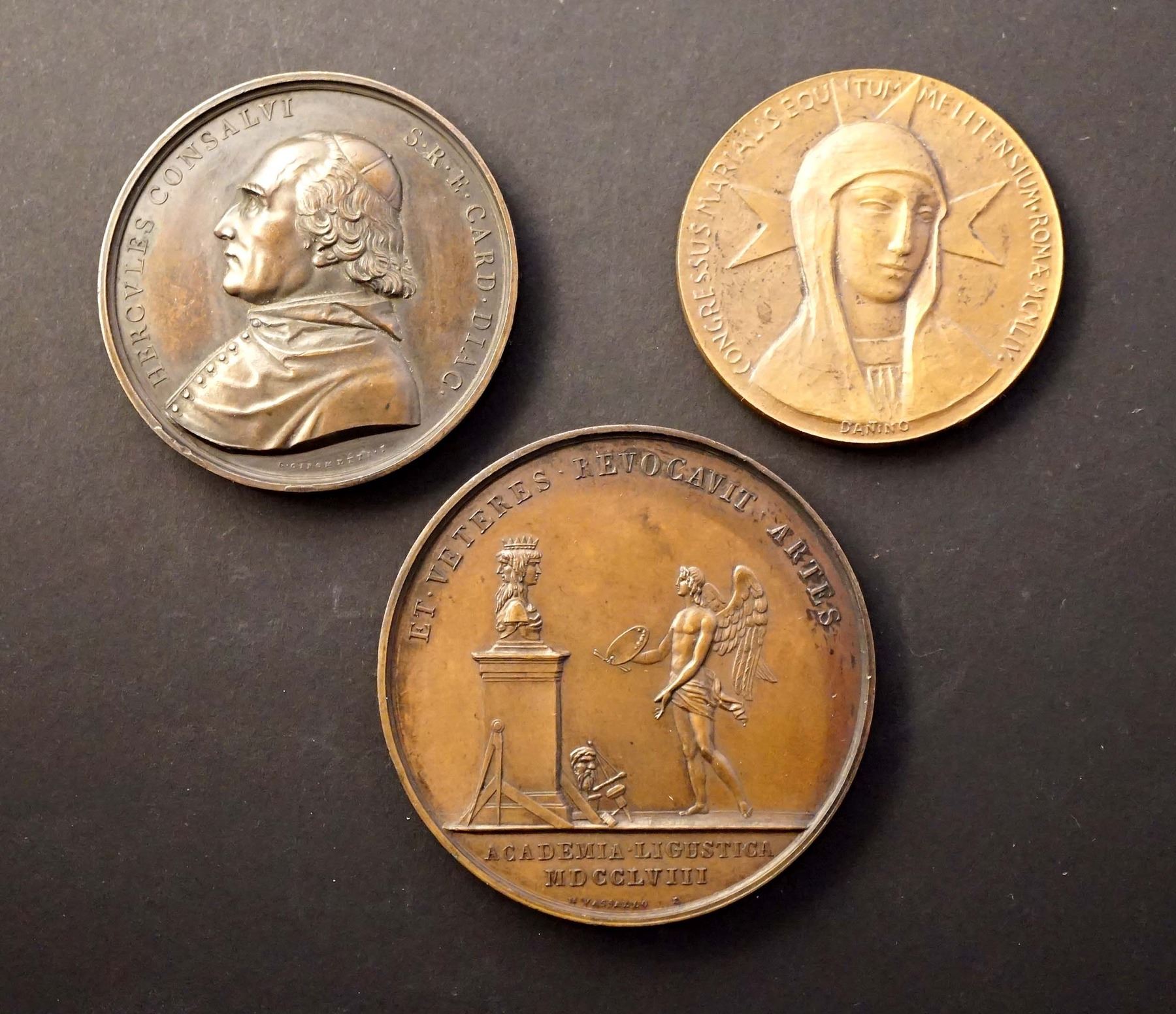 1824 Cardinal H. Consalvi by Girometti AE-54 77.6 gms. Edge: Plain EF, 1840 Ligustica Academy Geneo by Vassallo Avignon #379 AE-62 84.1 gms. Edge: COPIES UNC and 1954 Order of Malta Madonna Medal by d'Anino AE-48 40.1 gms. EF