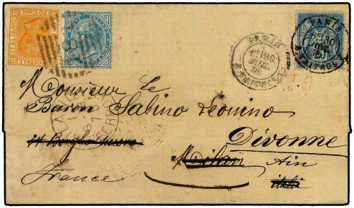 1878(July 30) Cover from Paris to Milan franked by Type Sage 25c blue tied by Paris cds, forwarded on arrival in Milan to Divonne, France and mailed back with 1877 10c blue and 20c orange colour change tied by Milano Ferrovia-181 duplex in black. An unusual franking and attractive redirected cover. Scott 28,36.
