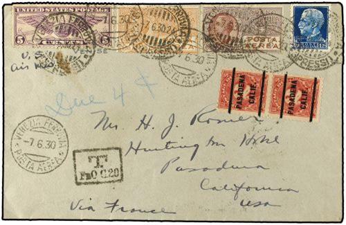 1930 Cover prepaid Airmail to PASADENA, California franked by USA Airmail 5 c. violet (Scott C12) used together with Italy Airmail 1928 80 c. red brown & purple with 1 L. 50 c. orange tied by VENESIA FERROVIA-POSTA AEREA cds´s. On arrival in Pasadena the cover was charged 4 c. due with pair of precancelled 2 c. Dues and framed handstamp in black. Scarce and fine usage.