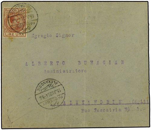 1925 (June 15) Cover to Alexandria franked by Italy ´Marca Da Bollo´ 1 lire brown, apparently accepted for payment and tied on arrival by ´Paquebot/Alexandrie´ cds, with repeated strike of cancel below. Unusual and appealing cover.
