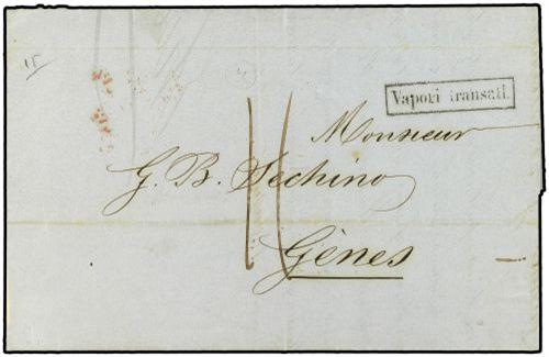 1857 BAHIA to GENOA bearing boxed VAPORI TRANSATL. Indicating carriage from South America by Cavour´s short-lived Transatlantic Steamer Company and one of only 11 voyages. Rare. Charged single rate of 11 decimes (L1.10c.).