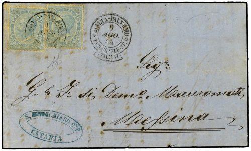 1864 Entire from CATANIA to MESSINA franked two 10 c. VEII posted on board and cancelled with the ship´s "Keyhole"-type datestamp MALTA-PALERMO PIROSCAFI POST. i ITALIANI.