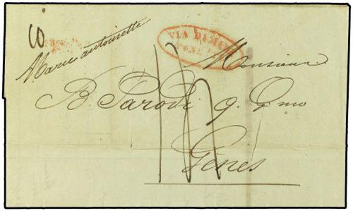 1837 Entire from MARSEILLE bearing red oval-framed VIA DI MARE PONENTE, applied to mail arriving by sea from ports west of Genova as far as France. Carried by the "Marie Antoinette". Disinfected by slitting. Weighing 10 grammes and rated at "14" decimes.