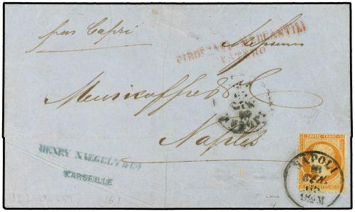 1865 Entire from MARSEILLE franked 40c Napoleon Empire Franc. cancelled on arrival by a NAPOLI cds. Obverse also bears rare two-line PIROSCAFI MERCANTILI ESTERO maritime handstamp in red.
