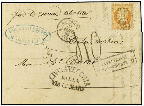 1865 Entire from MARSEILLE franked 40c. Napoleon cancelled "2240" gros chiffres and bearing boxed AFFRANCHISEMENT INSUFFISANT. Obverse also bears maritime arrival handstamp CIVITAVECCHIA DALLA VIA DI MARE + "40" cents charge mark. Carried by the "General Caleatrices".