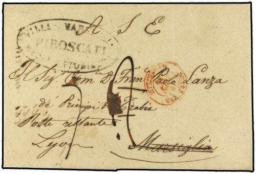 1847 Entire from NAPLES to MARSEILLE, redirected to LYON, bearing large oval-framed cachet in black PIROSCAFI-VILLA MARSIGLIA * MARIA ANTONETTA. This was the cachet of a French company operating a coastal service under the Tuscan flag with these two ships. Original charge of "3" decimes altered to "7".