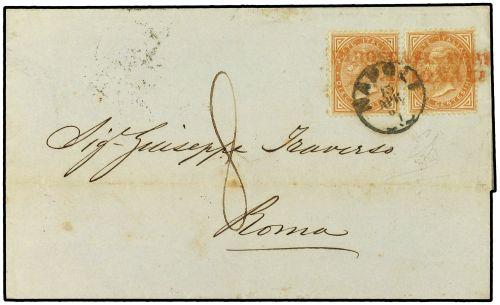 1864 Entire from PALERMO to ROME franked two 10c. VEII posted on board ship and cancelled red two-line PIROSCAFI-POSTALI NAZIONALI (Type I) + NAPOLI cds on arrival in transit at that port. Rated "8" bajocchi on reaching destination. Signed DIENA.