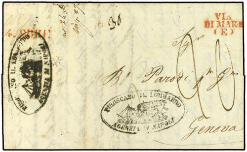 1841 Entire of GENOVA bearing illustrated oval cachet for PIROSCAFO "IL LOMBARDO" - AGENZIA DI NAPOLI together with red maritime arrival handstamp VIA DI MARE (E). Rated "20" decimes.