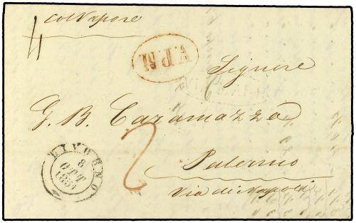 1851 Entire taken to the Post Office at LIVORNO and postage paid for the letter to be carried outside the postal service. The handstamp V.P.M. (Via particolare Marittima) was applied and the letter handed back to the sender who then sent it by the ship of his choice. On arrival at Palermo a red oval-framed VIA MARE handstamp was applied. Rated "2" grana. RARE.