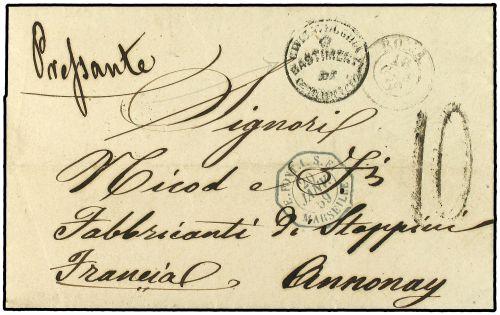 1859 Entire to ANNONAY, France from ROME bearing despatch datestamp and maritime transit CIVITAVECCHIA * BASTIMENTO DI COMMERCIO, indicating the letter was placed on a non-packet ship. On obverse also, octagonal French entry datestamp E. PONT. I.S.F. MARSEILLE together with a tampon "10" decimes charge.