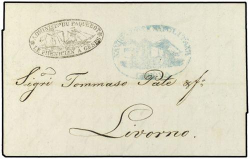 1843 Entire to LIVORNO bearing oval illustrated cachets ADMINIST. on DU PAQUEBOT* LE PHENICIEN A GENES and a blue NAVIGAZIONE NAPOLITANE GENOVA both applied on departure.