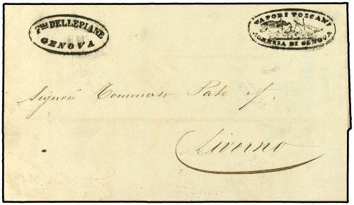 1846 Entire to LIVORNO bearing illustrated cachet VAPORI TOSCANI AGENZIA DI GENOVA of the Dellepiani Brothers. Illustrated letterhead paper for the "M. Antonietta" and "Leopoldo II".