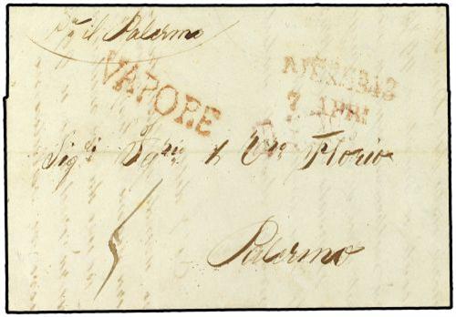1843 Entire to PALERMO bearing red straight-line VAPORE (Steamboat) applied on departure from MESSINA. Rated "5 grana" on arrival. Carried by the PALERMO. Recorded use in red 1842 and 1843.