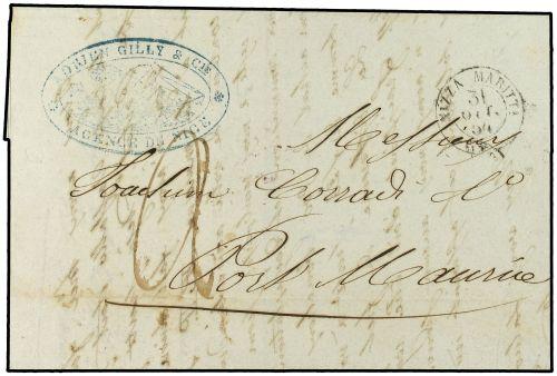 1854 Entire to PORTO MAURIZIO from NIZZA bearing departure cds and blue oval illustrated ship agent´s cachet of ADRIEN GILLY & Cie * AGENCE DE NICE. Rated "2" decimes on arrival. Carried by the "OCEAN".