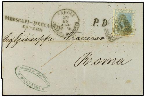 1868 Entire to ROME from PALERMO franked 20c. cancelled "184" a punti with NAPOLI UFF. SUCC. DI PORTO datestamp in association. Obverse also bears maritime two-line handstamp PIROSCAFI-MERCANTILI ESTERO indicating carriage by foreign merchant ship.