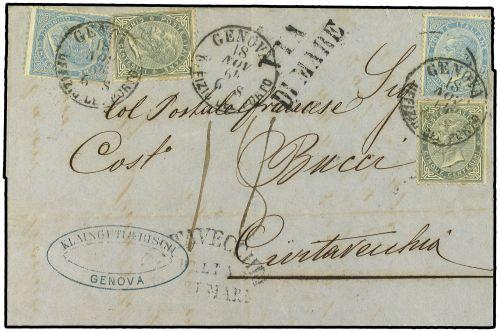 1864 Entire to the Papal States franked 5c (2) + 15c (2) -double weight rate- cancelled GENOVA cds of the Port Office. Landed first at Livorno where struck with a two-line VIA DI MARE. Thence again by sea to its destination where the handstamp CIVITAVECCHIA/ DALLA/ VIA DI MARE was applied. Rated at "18" bajocchi as neither country accepted the other´s postage. Unusual double maritime handstamp entire.