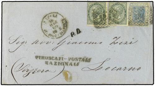 1869 Envelope to LOCARNO, Switzerland, from PALERMO, Sicily, franked 5c(2) and 20c. VEII, cancelled in transit at Naples where the two-line maritime transit handstamp PIROSCAFI-POSTALI NAZIONALI was also applied. Thence by rail to Milan and Arona, followed by carriage on the Lake Maggiore steamer to Locarno, as evidenced by datestamps on the reverse.