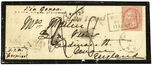 1865 Mourning cover to SIDMOUTH, Devon, from someone serving on H.M.S. "Surprise" and put into the Italian Post Office at Tunis. Franked 40 c. VEII and cancelled on arrival at CAGLIARI with boxed PIROSCAFI POSTALI ITALIANI and where the handstamp DA TUNISI was also applied. Underfranked and a manuscript "4" decimes applied, converted to "8d" on arrival in UK.