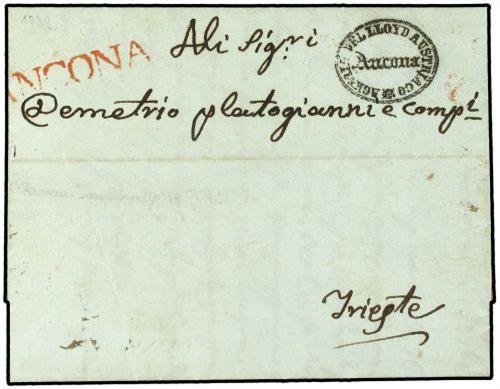 1839 Paid entire to TRIESTE bearing red s/1 ANCONA + black oval-framed AGENZIA DEL LLOYD AUSTRIACO * ANCONA. On reverse, red IMPe. (Impostate-taxed) and manuscript "5"·.