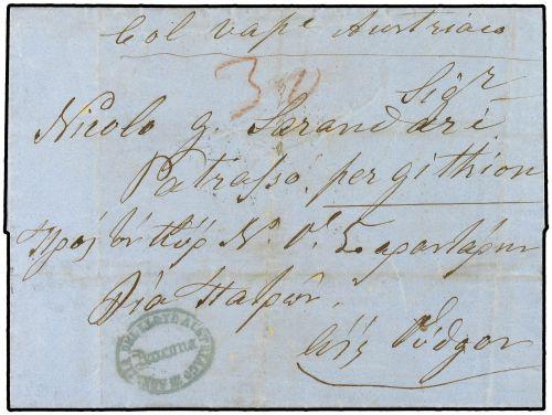1857 Unpaid entire to PATRAS bearing green oval-framed AGENZIA DEL LLOYD AUSTRIACO * ANCONA maritime despatch handstamp. Rated "30" lepta on arrival.