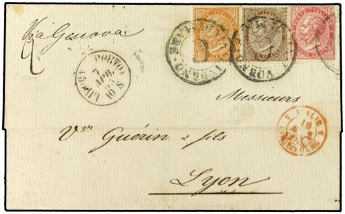 1865 Wrapper to LYON from NAPOLI franked double rate with VEII 10c., 30c. & 40c. and endorsed "Via Genova". Posted on board ship, the letter was off-loaded at Livorno where it was stamped with the Port Office timed cds and the adhesives cancelled with a LIVORNO * VIA DI MARE "C" handstamp. This combination of handstamps was applied on board to mail arriving in non postal convention ships and on which there was a 10% charge as captain´s fee. On reverse, TORINO and UFF.AMB.TORINO-SUSA transits, on obverse, red French entry cds ITALIE 4 LANSLEBOURG.